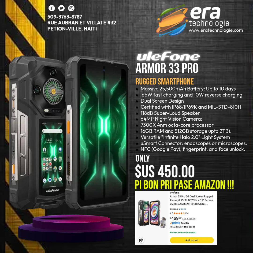 Meet the Ulefone Armor 33 Pro, the rugged smartphone that redefines what "long-lasting" means. Built for the most demanding environments on Earth, this beast features a record-breaking 25,500mAh battery, a versatile Secondary Rear Display, and professional-grade Night Vision.